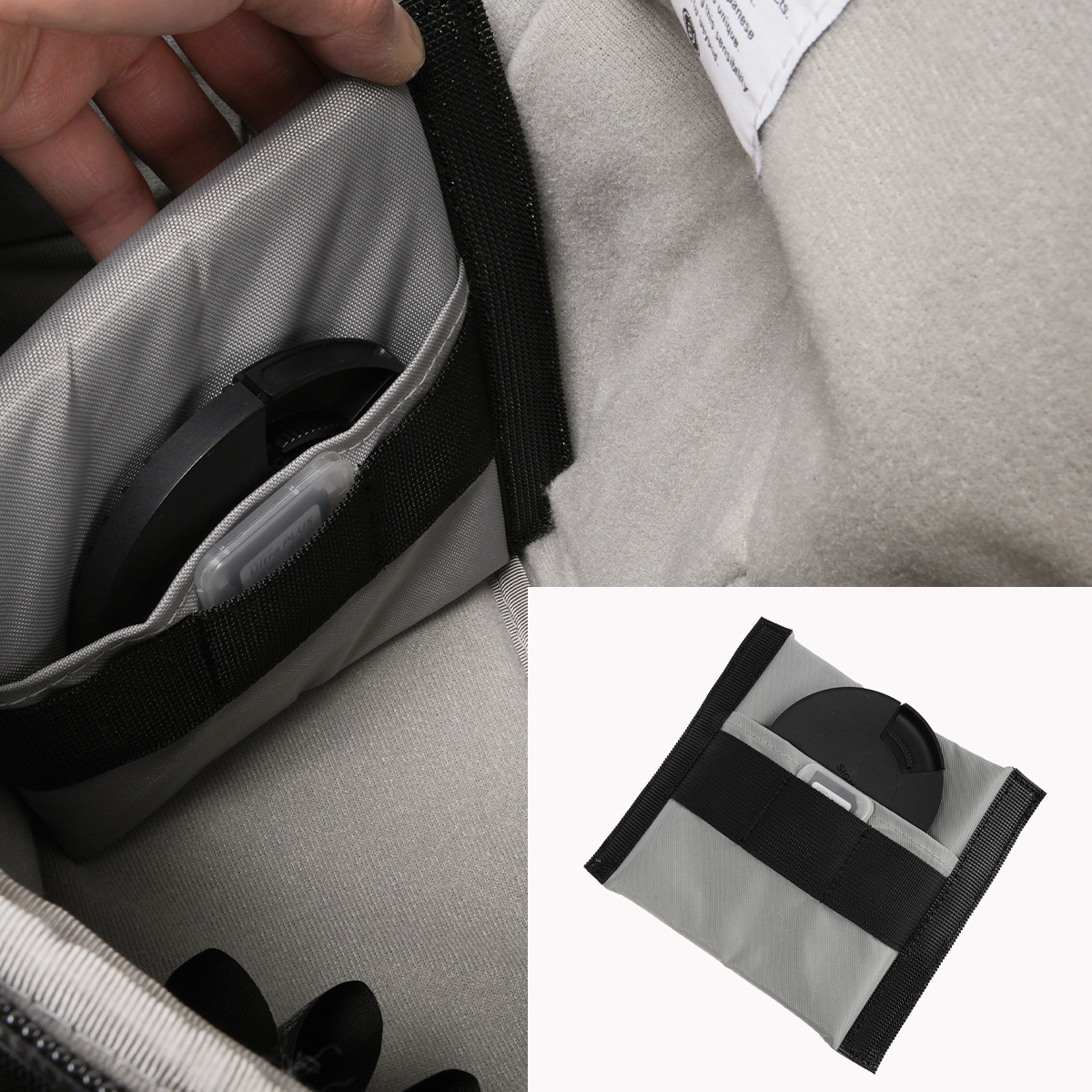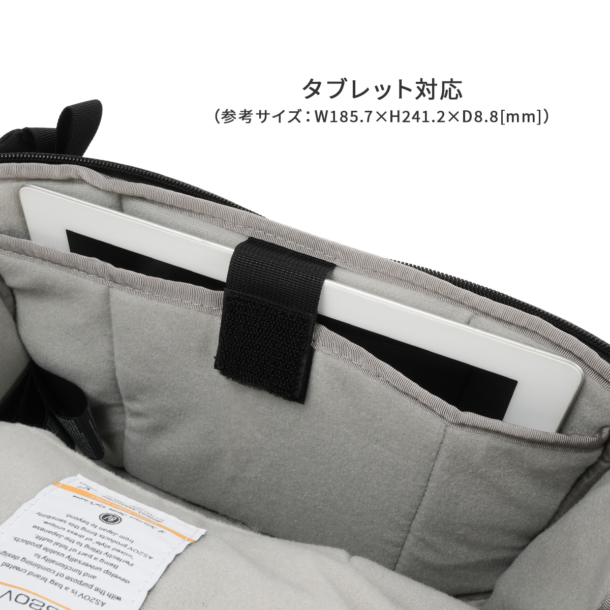 カメラを安全に収納できる専用ポケット。クッション性の高い素材でデバイスを保護し、ビジネス出張でも安心して持ち運べます。