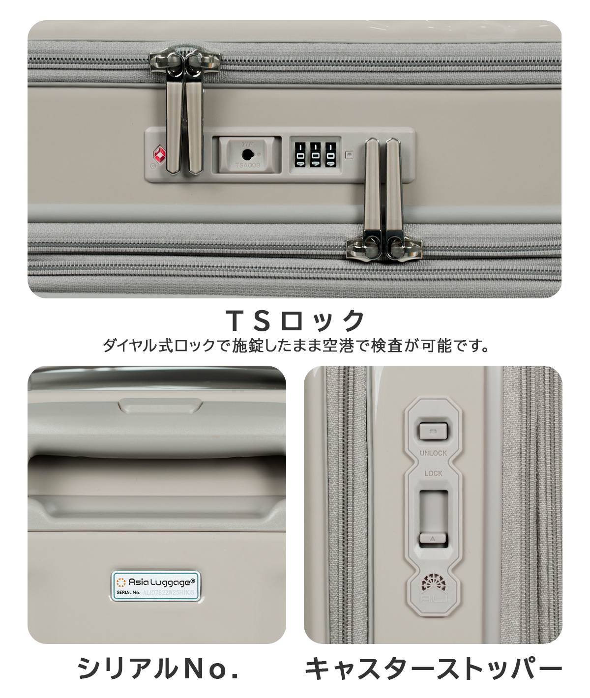 ●このスーツケースのTSAロックはダイヤルコンビネーションロックです。鍵穴はTSA職員が緊急の際に解錠して検査を行うためのものであり、差し込み式のキーは付属しておりません。