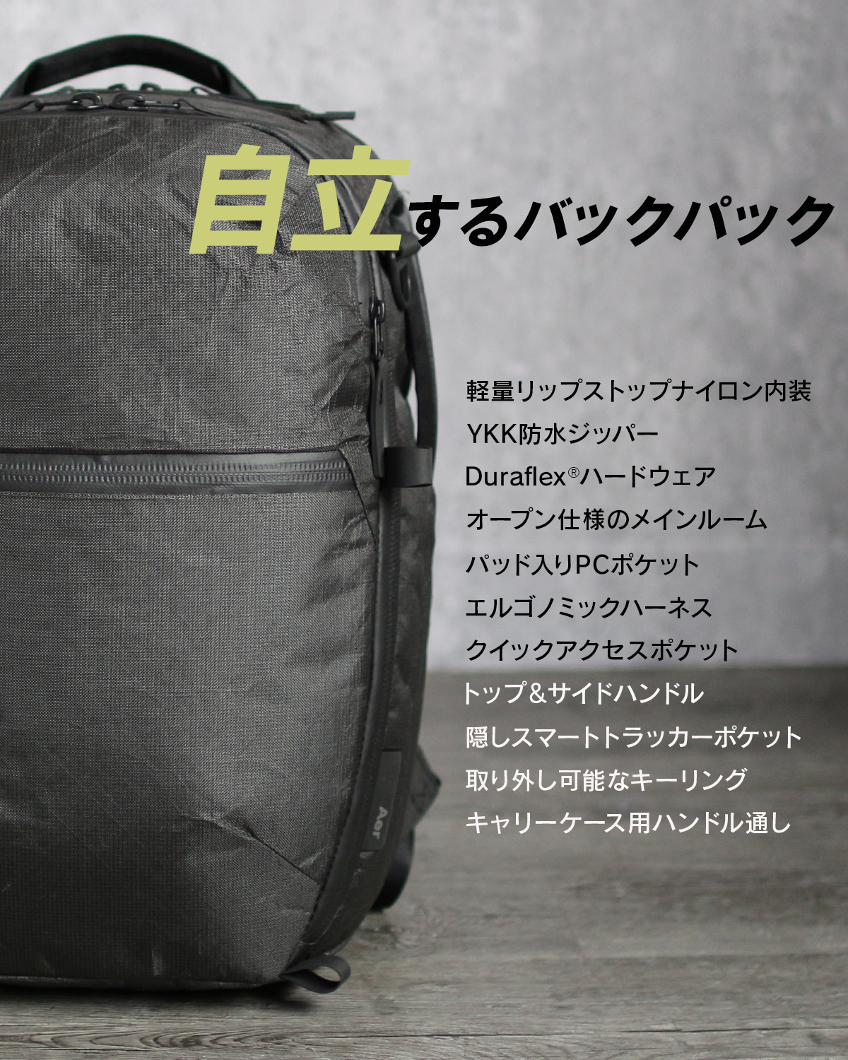 Aerはギアやトラベルに関心を持つデザインチームで構成され、サンフランシスコベイエリアを拠点に企画し、日々耐久性のある高品質な製品を提供することに情熱を注いでいます。2014年、ジムとオフィス向けバッグを一つの現代的なデザインにするクラウドファンディングプロジェクトから誕生しました。Aerは現代のニーズを満たす新たな視点を提案し、都市生活をよりシンプルに豊かにすることを使命としています。