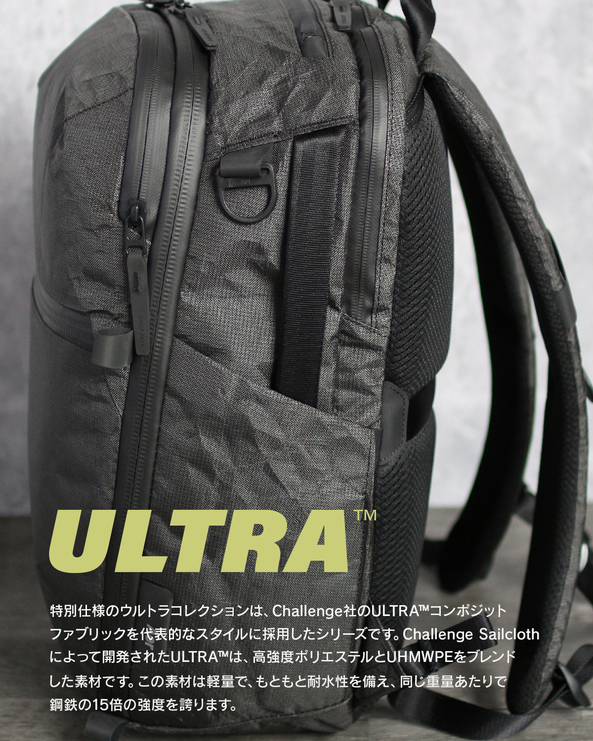 Ultra400Xとは 素材はナイロン等に比べ耐摩耗性に圧倒的に優れ、約20%軽量なChallenge Sailcloth社のUltra400Xを使用しています。 UltraはUHMWPE (超高分子量ポリエチレン) を使った生地で、耐水性があり、グラム単位でスチールの 15 倍の強度を誇ります