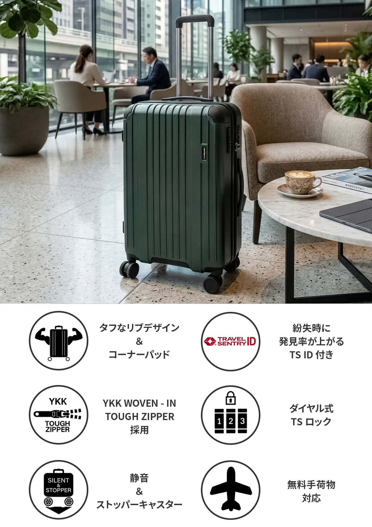 ●このスーツケースのTSAロックはダイヤルコンビネーションロックです。鍵穴は空港検査官が緊急解錠に使用するもので、差し込み式のキーは付属しておりません。
