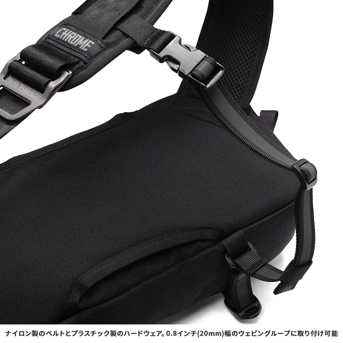 自転車走行時やアクティブな移動時でもバッグを固定できるため、快適なライディングや歩行をサポート。0.8インチ(20mm)幅のウェビングループに取り付け可能で、多くのCHROMEバッグに対応します。