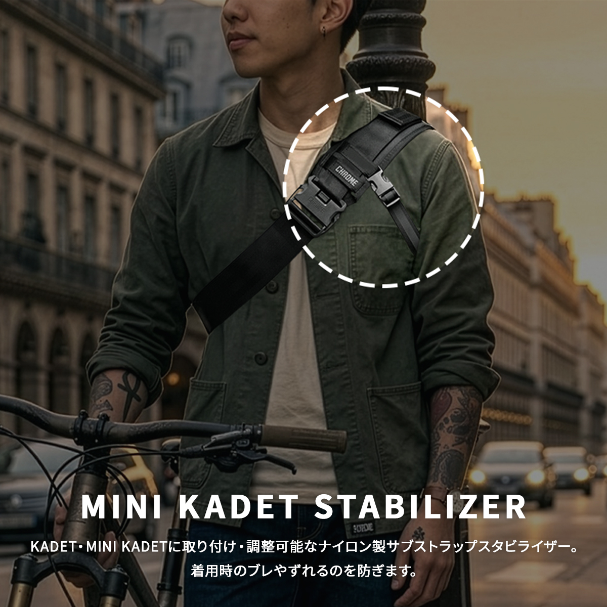 KADETやMINI KADETなどに装着できるナイロン製サブストラップスタビライザー。バッグ着用時のブレやズレを軽減し、身体にしっかりフィットさせることで安定した装着感を実現します。