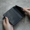 コンパクトなサイズ感ながら収納力が充実。スナップボタン式で開閉しやすく、札入れ1室とL字ファスナー式小銭入れを備えています。カードポケットは8室、さらにフリーポケットや前面のIDカードポケットも配置され、必要なものを整理して収納可能です。