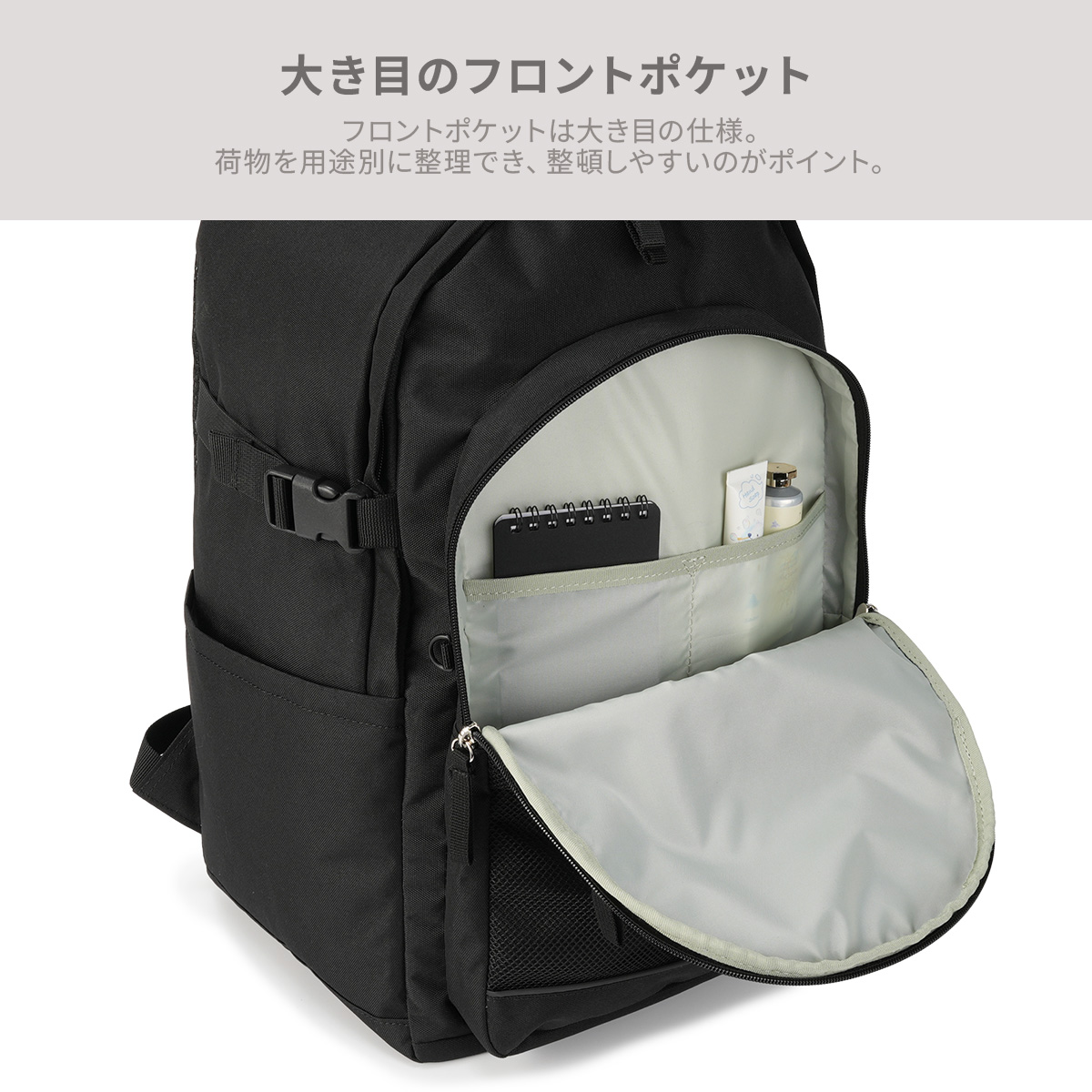 内外に豊富なポケットが配置されており、荷物の整理がしやすいデザインです。内側にはPCポケットがあり、ノートPCやタブレットを安全に収納可能。外側にはファスナーポケットやメッシュポケット、サイドポケットがあり、小物の収納にも便利です。