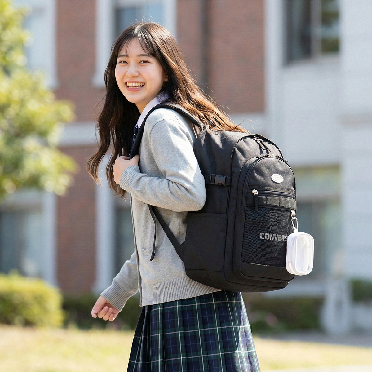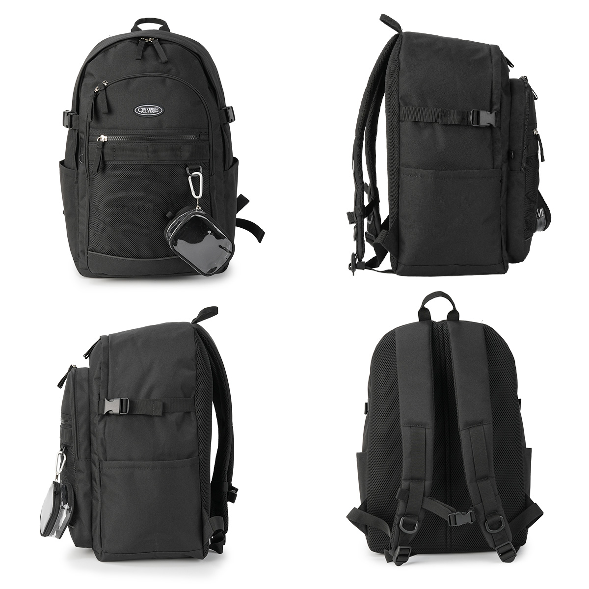 フロントにはコンバースの刺繍ロゴが施され、シンプルながらもブランドの存在感をしっかりと感じさせます。また、デイジーチェーンが付いているため、カラビナやアクセサリーを取り付けて自分好みにカスタマイズを楽しむことができます。