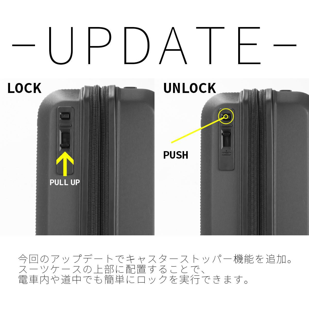 ワンタッチでON/OFFが切り替えられるキャスターストッパーを搭載。電車内や坂道でもしっかり固定でき、安心して移動が可能です。