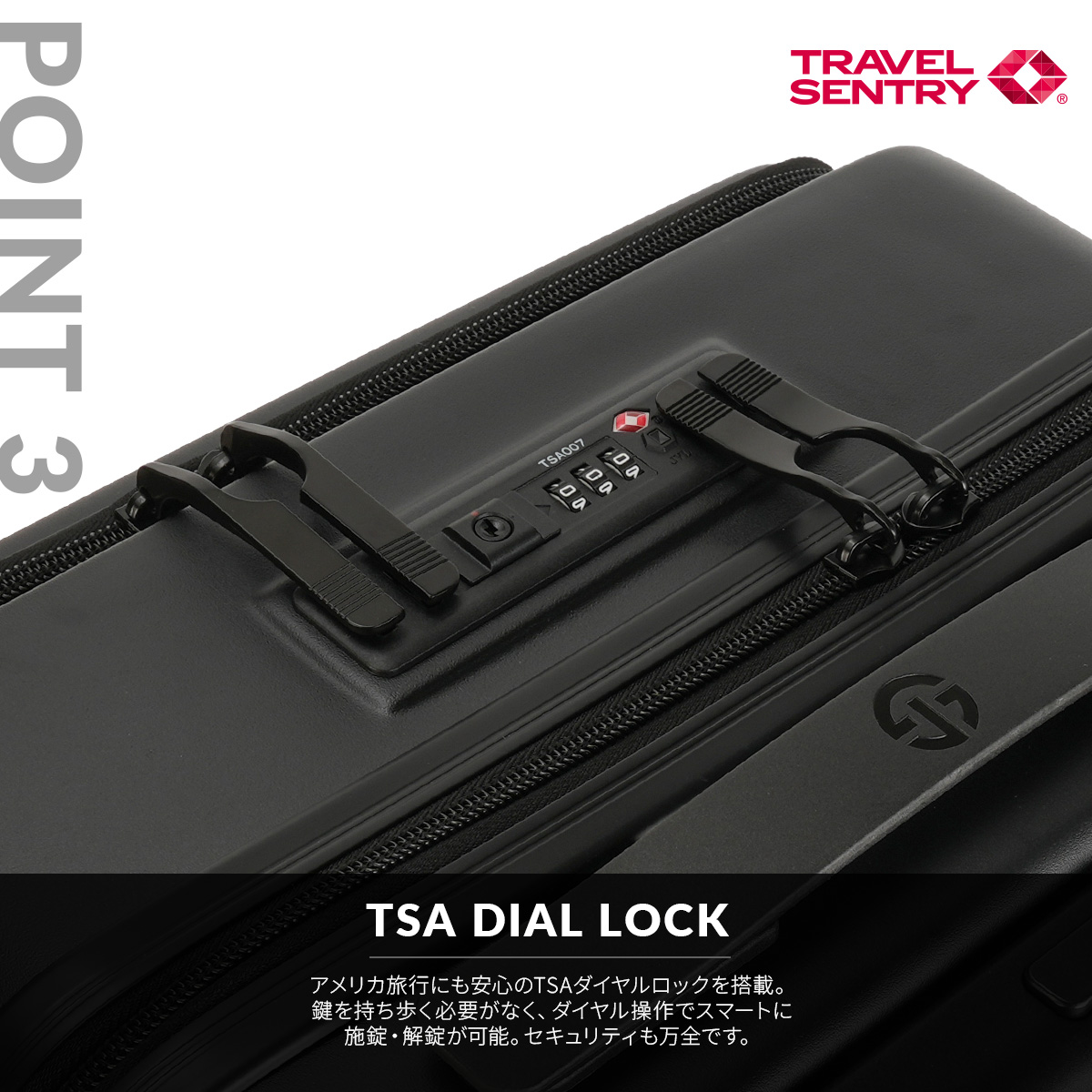 ●このスーツケースのTSAロックはダイヤルコンビネーションロックです。鍵穴はTSA職員が緊急の際に解錠して検査を行うためのものであり、差し込み式のキーは付属しておりません。