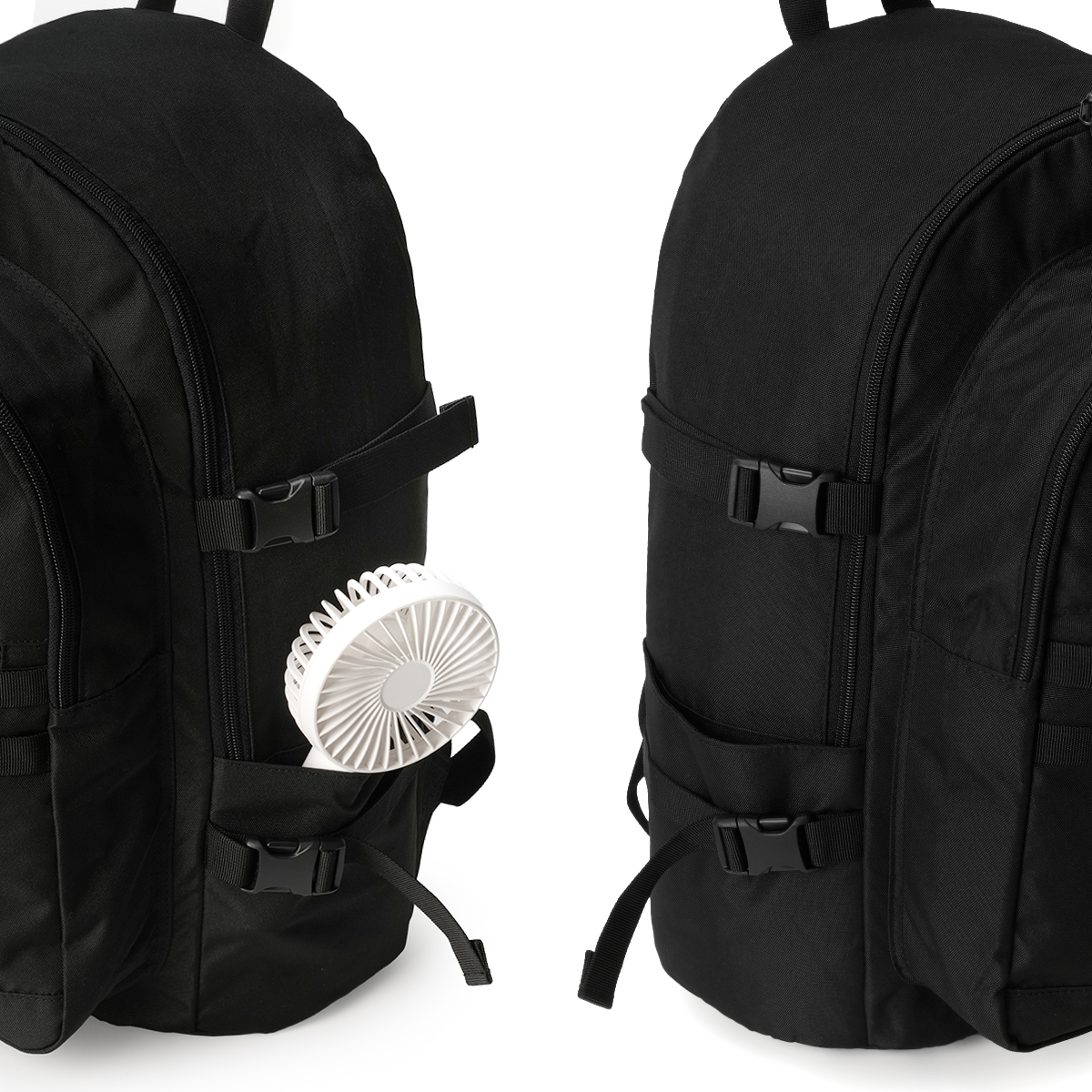 このバックパックは、内外に多彩なポケットが配置され、小物の整理がスムーズに行えます。内側にはオープンポケットやメッシュファスナーポケットを備え、外側にはファスナーポケットやサイドポケットがあり、ペンや小物の収納にも便利です。