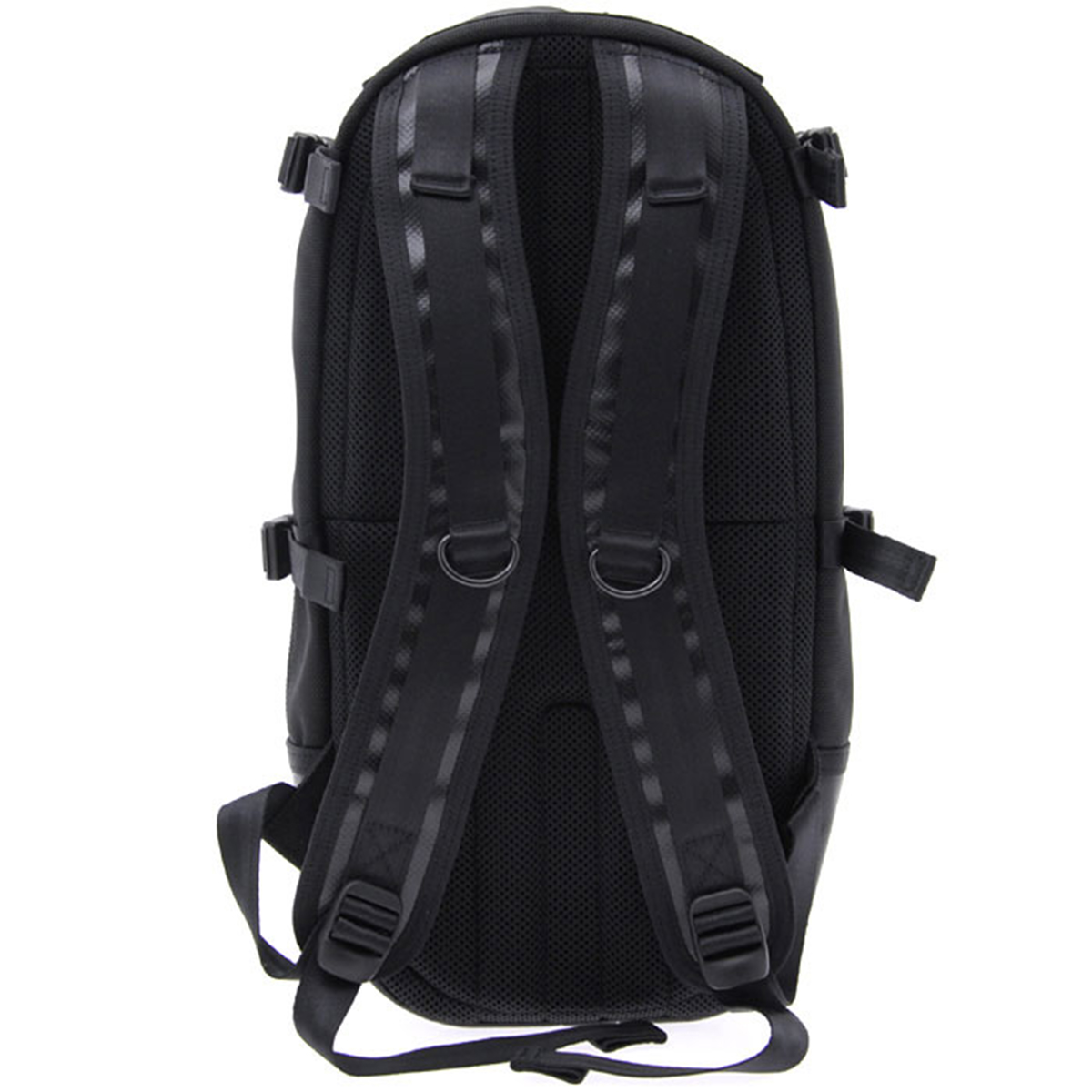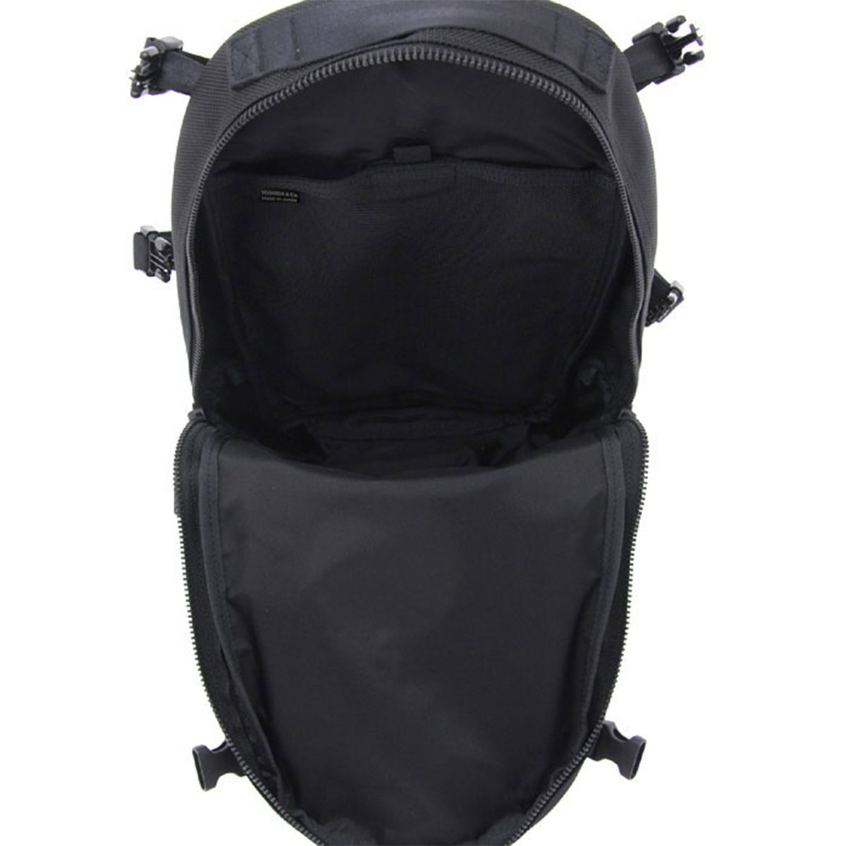 車のエアバッグや防弾チョッキにも使われる耐熱・耐摩擦・引裂強度に優れた66ナイロン糸で織り上げた日本製のバリスターナイロンをメイン素材にしています。一部分に工業用資材として用いられる耐水性の高いターポリン生地を使用しています。黒一色のワントーンでありながら、異なる質感の生地を組み合わせることでコントラストの効いたスタイリッシュなデザインに仕上げています。