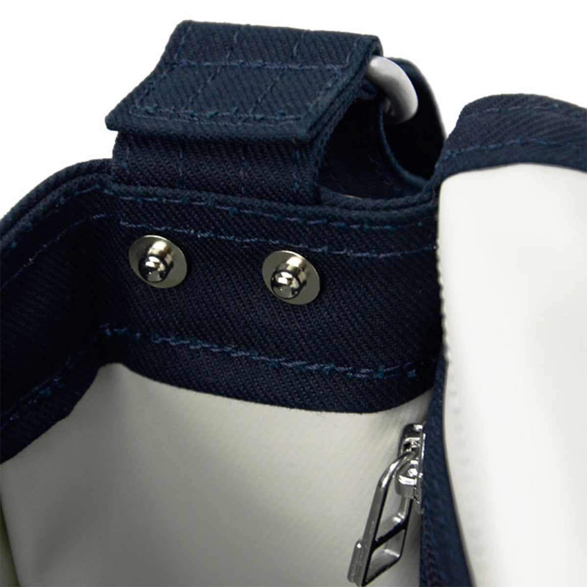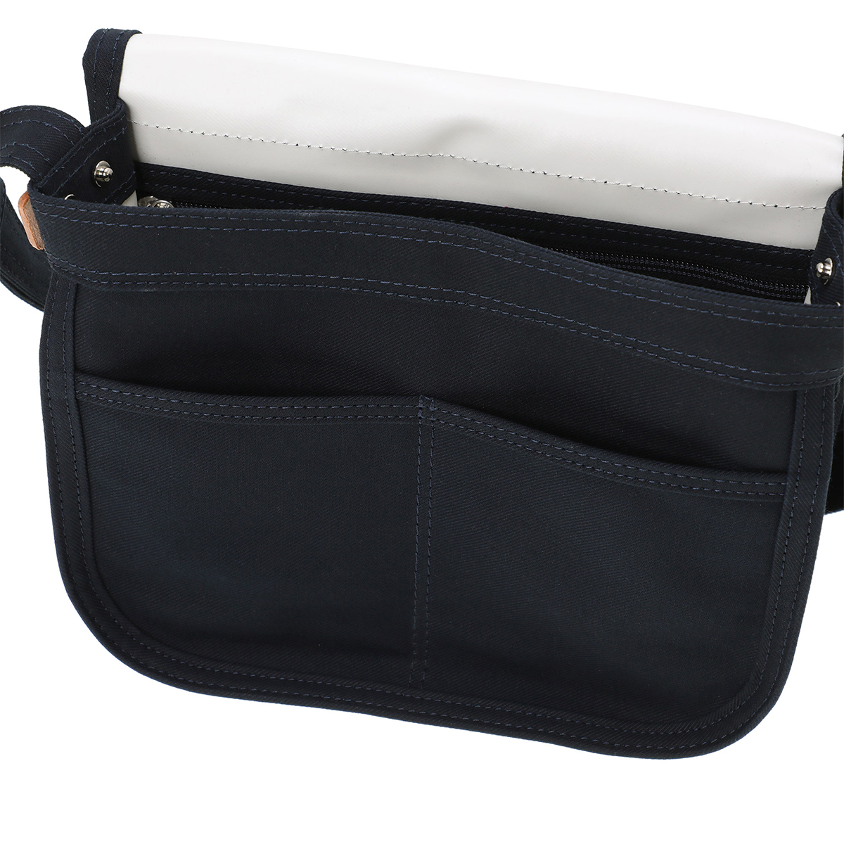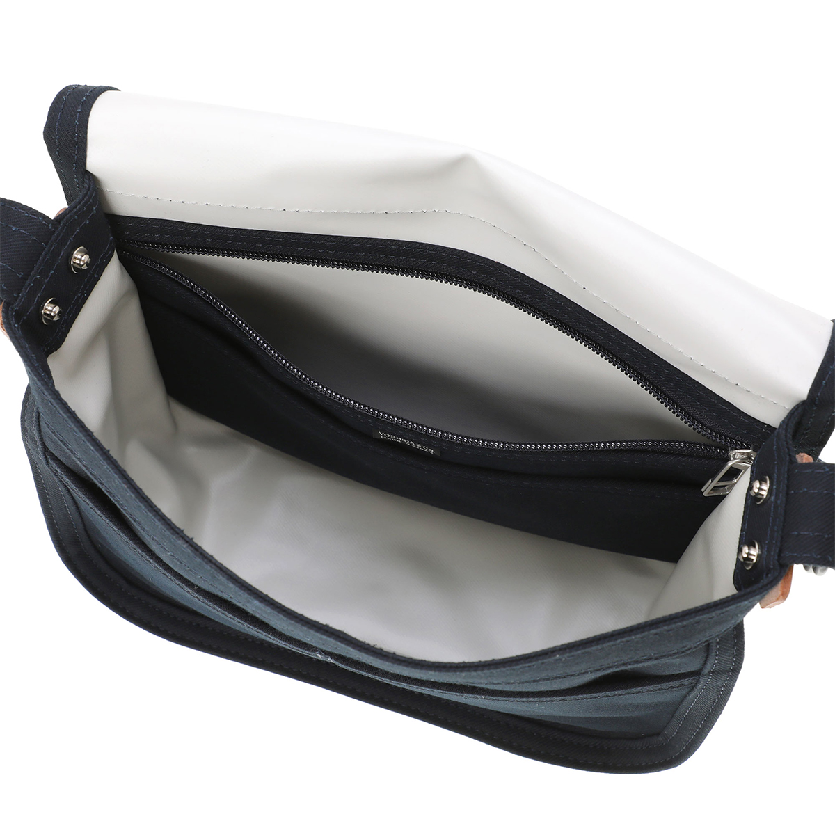 本体には、ワークウェアにも使用されるコットンサージを採用。通常よりも太番手で高密度に織ることで、上品な光沢感と耐久性を両立しました。裏面にはPVC加工を施し、防水性と軽さを兼ね備えています。