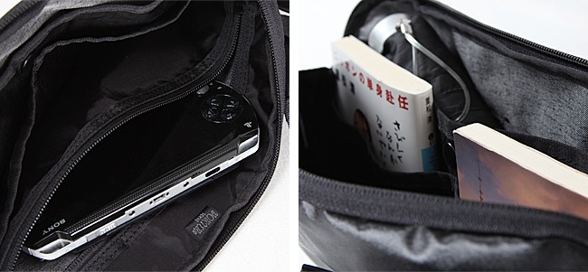 文庫本サイズが入るポケットを2つ、折り畳み傘なども入る横長のポケットを1つ搭載。