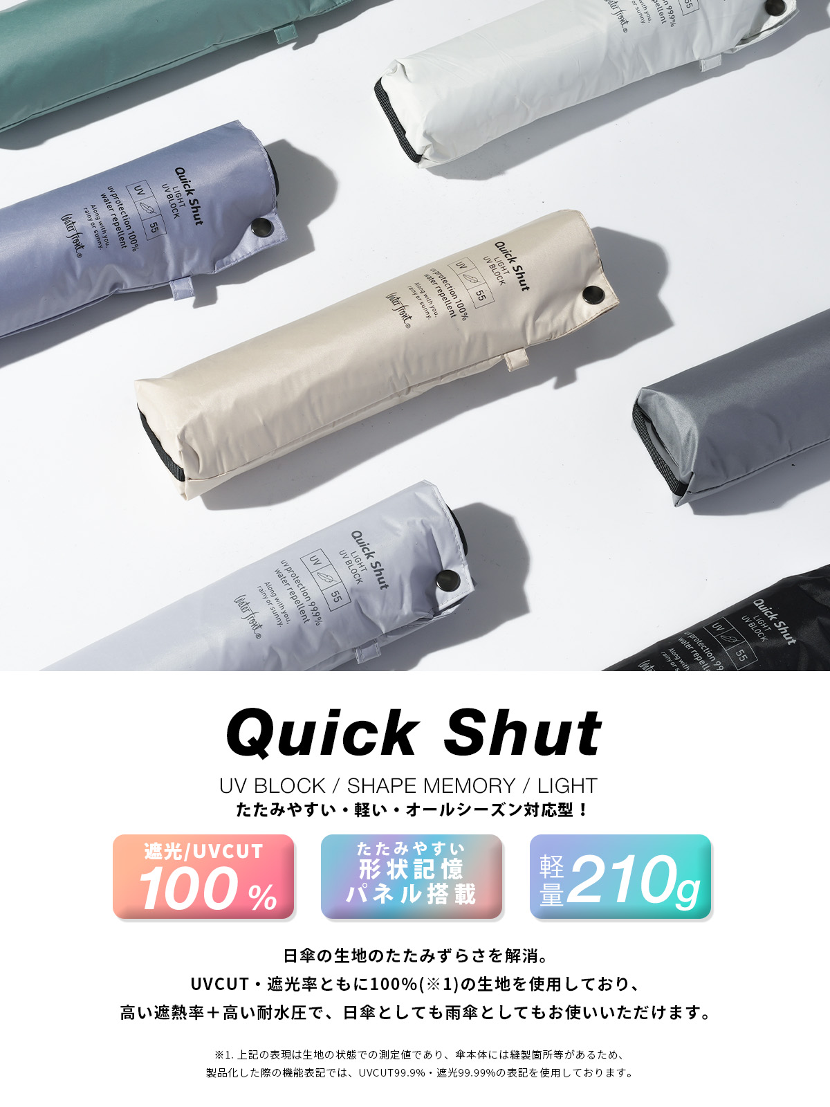 たたみやすさと軽さを追求した「クイックシャット® ライト」に、日傘機能をプラスしたオールシーズン対応モデル。晴れの日も雨の日も快適に使える、晴雨兼用折りたたみ傘です。