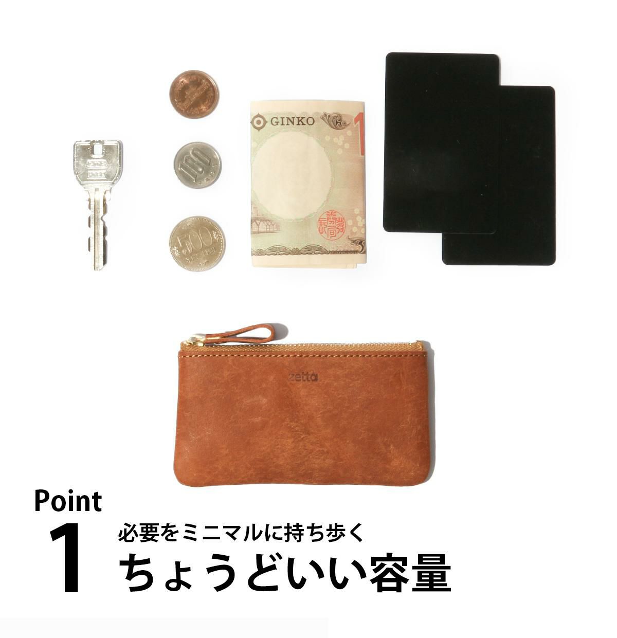 キーリングを備え、ホームキーとカード、そして少しの小銭とお札も入る程よいサイズ感を実現。