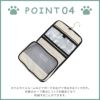 ホテルやバスルームなどでポーチを広げて吊るせるフック付き。内装のループ部分にフックを固定させて収納することができるので、持ち運びの際も邪魔になりません。