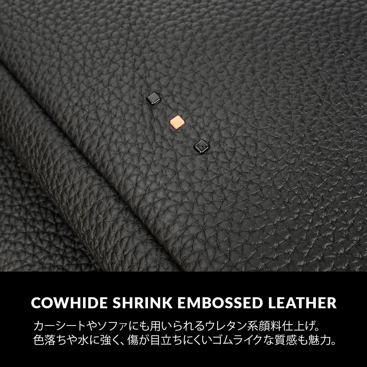 ・牛革シュリンクエンボスレザーを使用。カーシートやソファ等に使用するウレタン系顔料仕上げの為、色落ちや水等に強い機能性と傷の目立ちにくい特徴もあります。また、独特なゴムライクなタッチ感も魅力になります。