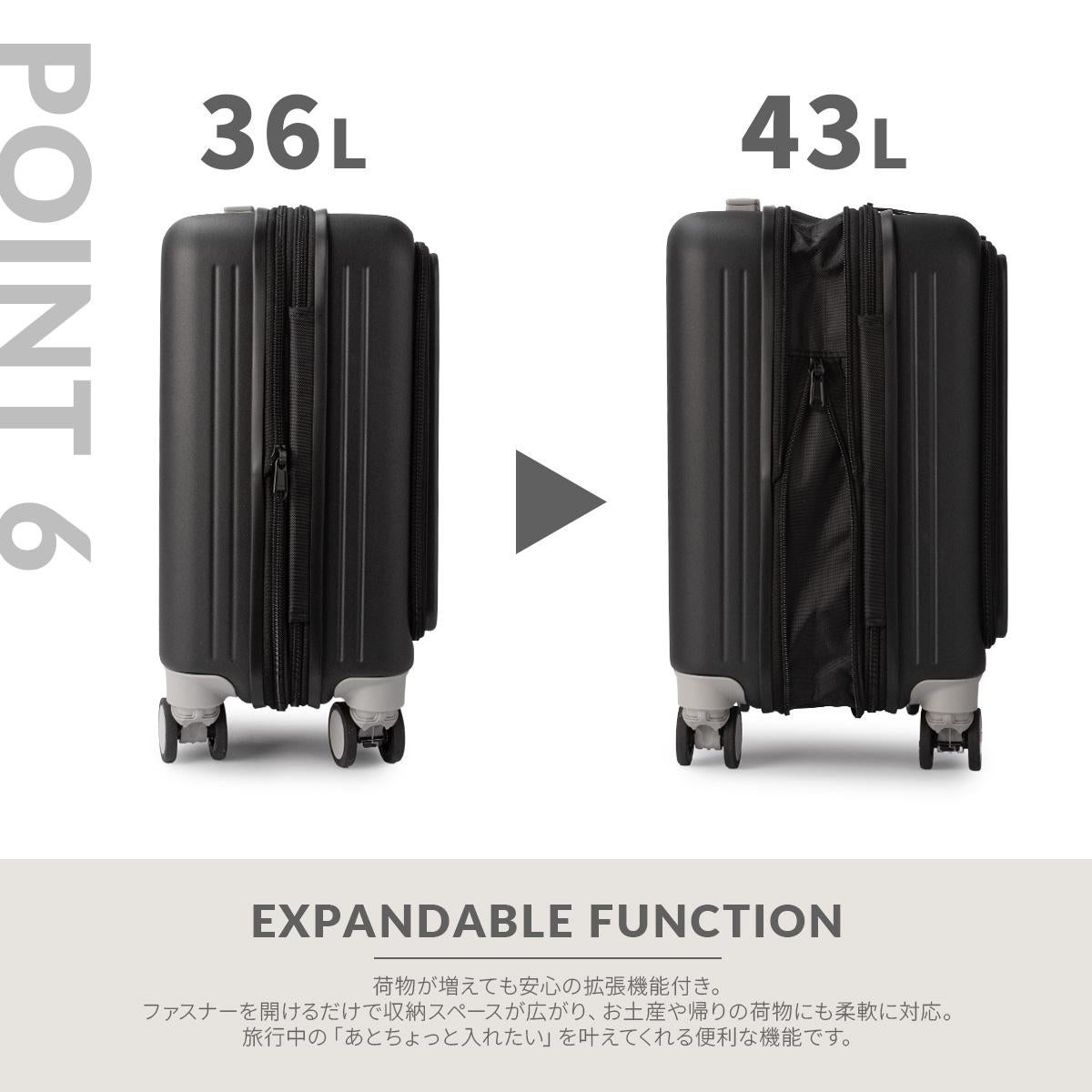 他の画像を見る アジアラゲージ アジアラゲージ マックススマート スーツケース Sサイズ SS 36L/43L 機内持ち込み フロントオープン 拡張機能付き ストッパー付き ドリンクホルダー 静音 A.L.I MAX SMART MS-8080-18W キャリーケース キャリーバッグ 価格 ¥ 23,980 税込 詳細を見る お気に入りに登録する