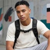 バックパックのショルダーストラップ同士を胸元で固定することで、バッグの揺れを抑え、重量を分散させるチェストストラップです。歩行時や自転車移動時の安定感を高め、肩への負担を軽減します。