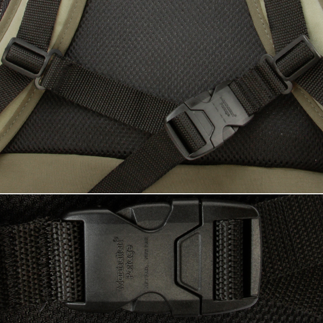 肩の圧迫感を和らげるチェストストラップが付属。バックル部分にはブランドロゴが刻まれ、さりげないアクセントになっています。