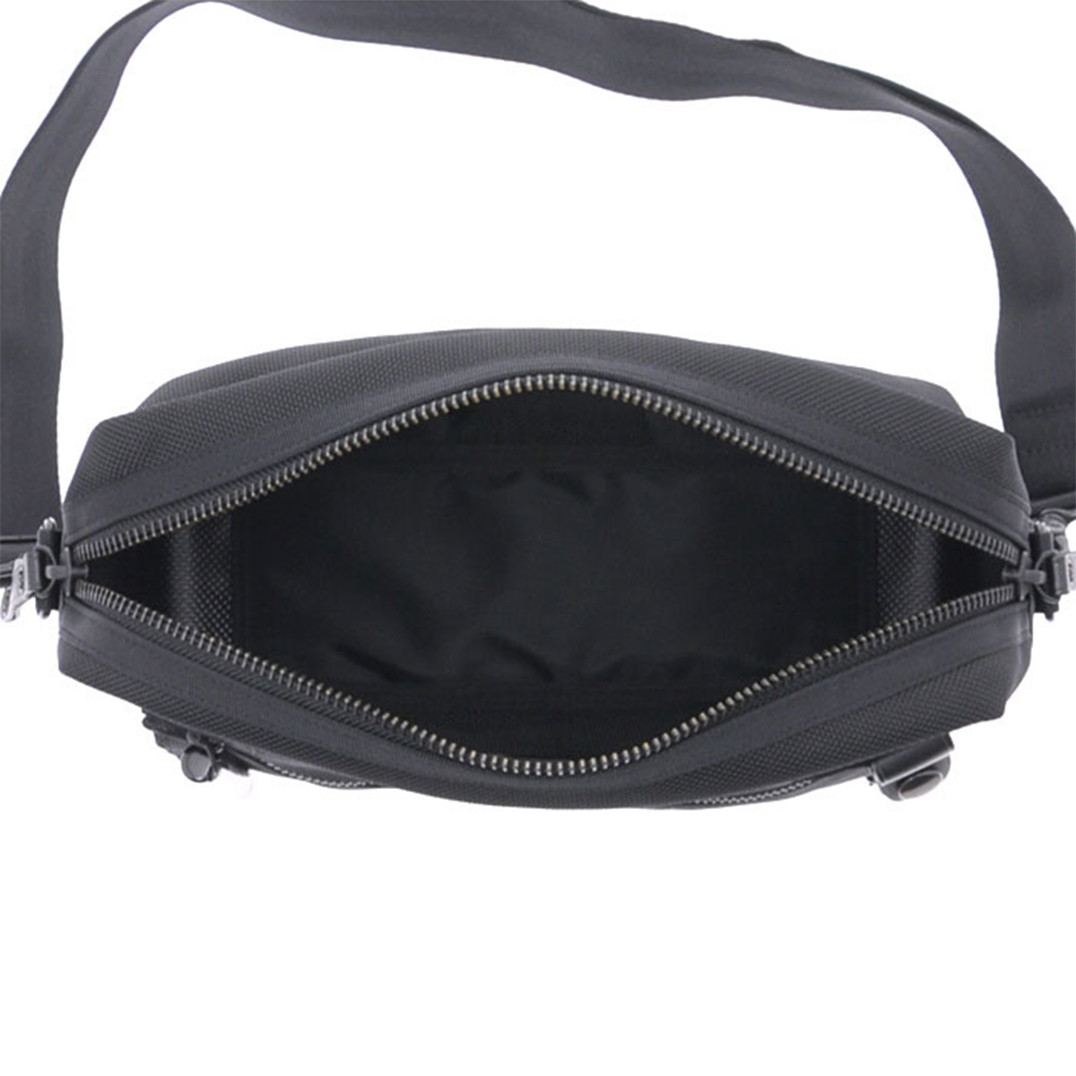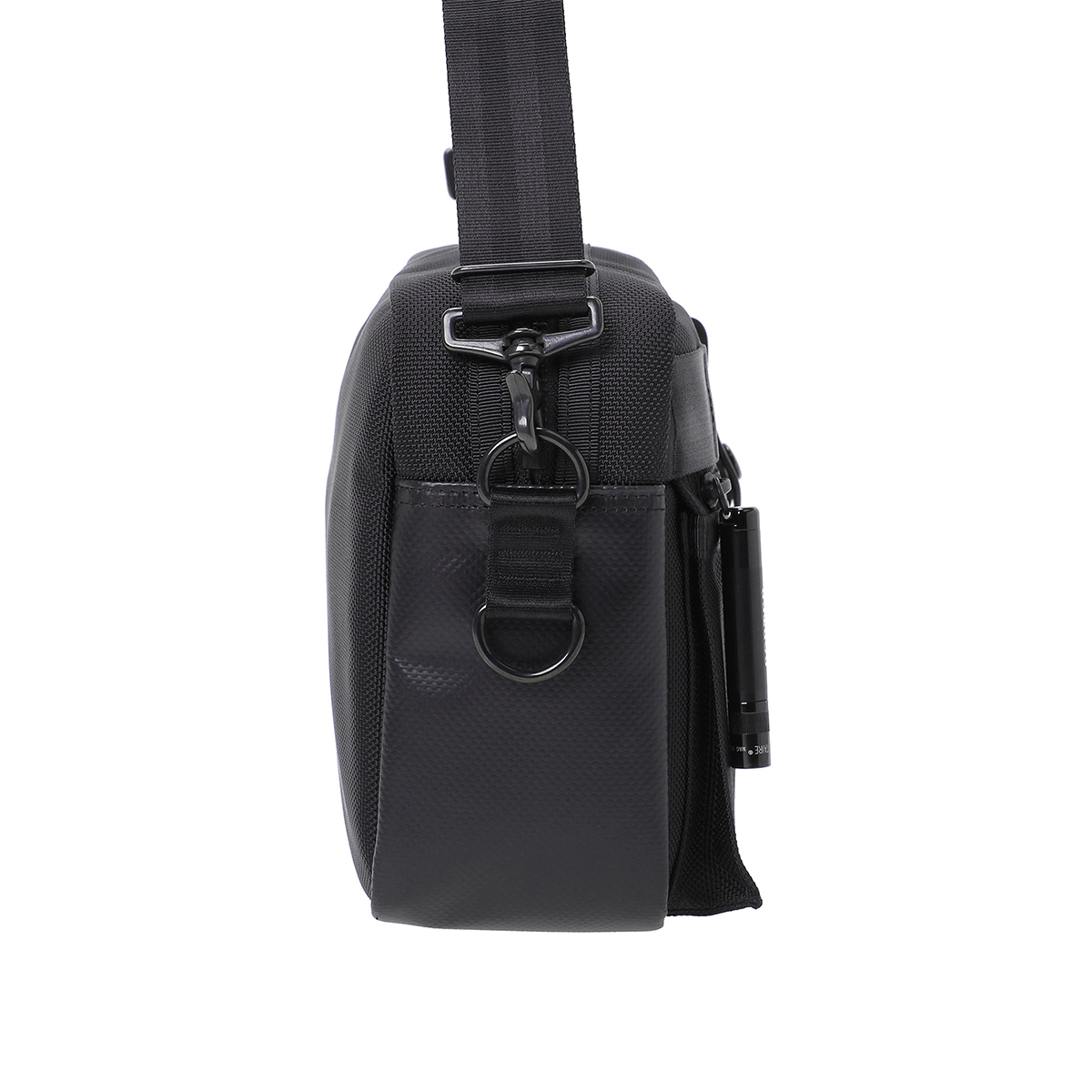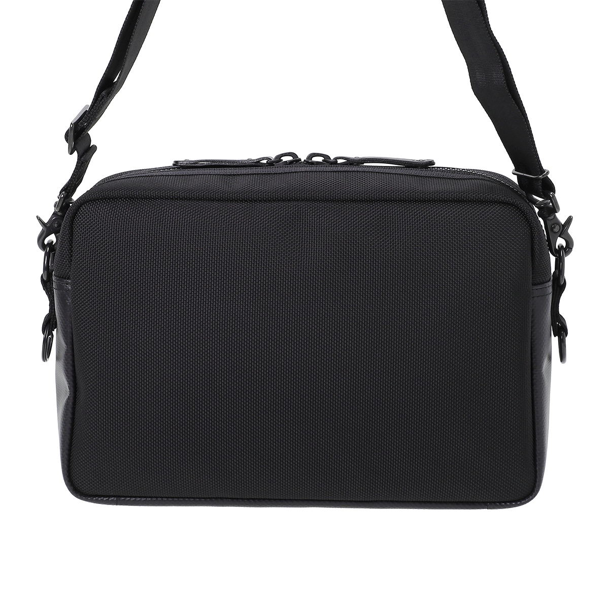 車のエアバッグや防弾チョッキにも使われる耐熱・耐摩擦・引裂強度に優れた66ナイロン糸で織り上げた日本製のバリスターナイロンをメイン素材にしています。一部分に工業用資材として用いられる耐水性の高いターポリン生地を使用しています。黒一色のワントーンでありながら、異なる質感の生地を組み合わせることでコントラストの効いたスタイリッシュなデザインに仕上げています。