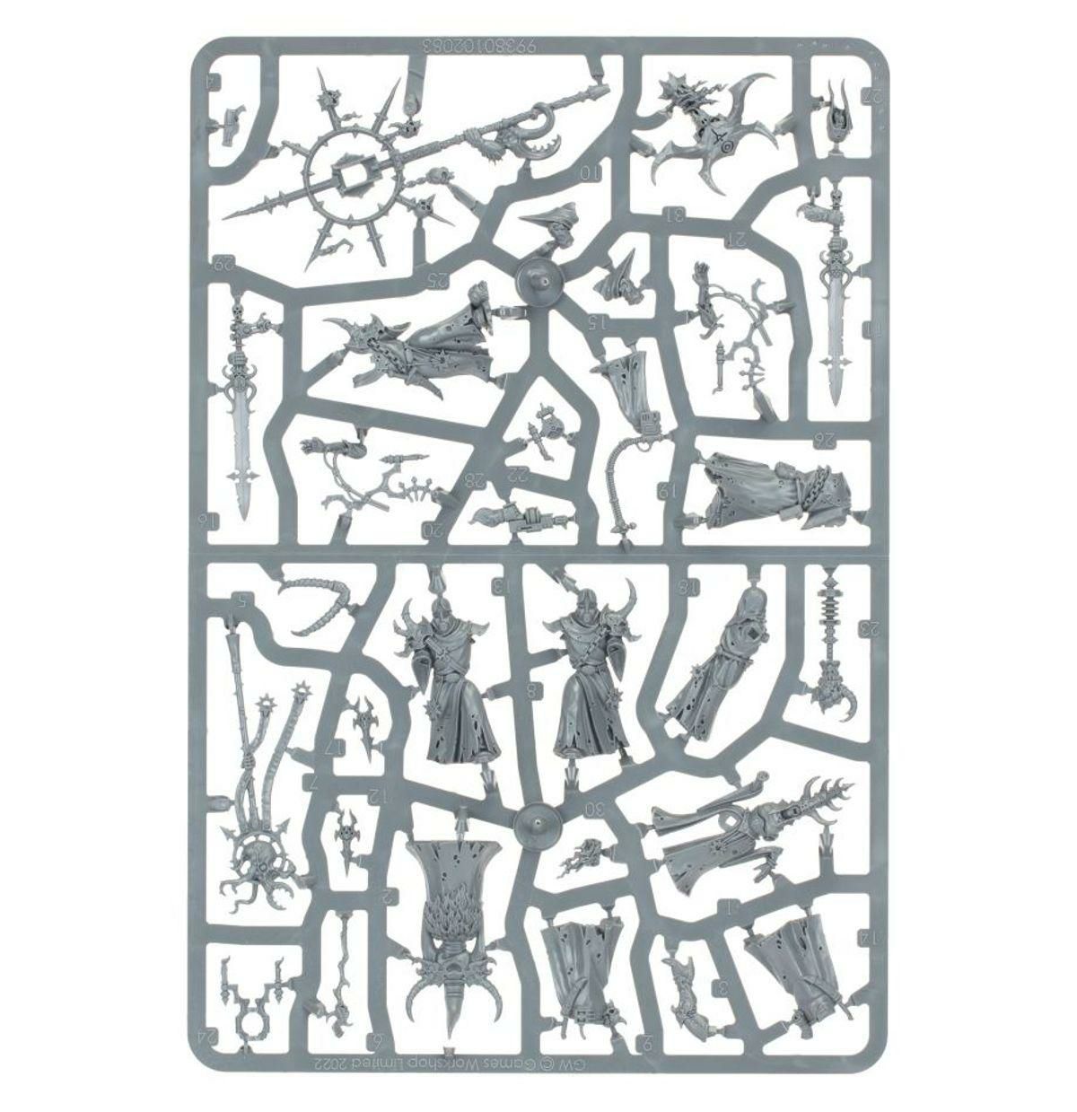 このマルチパーツ・プラスチック・キットは、5体のモデル(カルト・デマゴーグ1体、イコナーク1体、マインドウィッチ1体、祝福された刃2体)で構成される完全なダーク・コミューンを組み立てることができます。この邪悪な結社のメンバーは、カオス・カルトの信奉者を彷彿とさせる不吉なローブ、護符、そしてデーモンのマスクを身にまとっていますが、それぞれが役割にふさわしい独自の外観を誇っています。カルト扇動者は、そびえ立つ角のある仮面と肩甲を身に着け、羊皮紙の断片と汚れた使い魔で飾られた杖を振るっています。一方、イコナークは炎を轟かせるデーモンの象徴を掲げ、顔を影のような頭巾で隠しています。どちらも触手のような変異が特徴ですが、マインドウィッチは群を抜いて歪んでいます。フードをかぶったカルト信者の体に、膨張した切断された頭部がサイバーネットで祀られています。顔のない祝福された刃はそれぞれ、コミューンを守るために待機し、華やかな儀式用の剣を振り回しています。