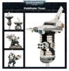 このキットには10??体のパスファインダーが含まれており、様々な方法で組み立てることができます。膝立ち、しゃがみ、立ちの姿勢など、様々な脚のオプションがあり、頭部のオプションも様々です。彼らは胴体、肩、膝、肘を覆う軽量の偵察装甲を身に着け、ファイアーウォリアーと同様の長くて優雅なヘルメットを着用します。彼らはパルスカービン、レールライフル、イオンライフルなど、様々な武器を携行できます。キットには、デビルフィッシュ戦車(別売)に搭載でき、バーストキャノンを装備した巨大な偵察ドローンが含まれています。このボックスセットには、円形ディスクの下に4本の突起を持つパルス加速ドローンと、その下にオーブを備えた重力抑制ドローンも含まれています。